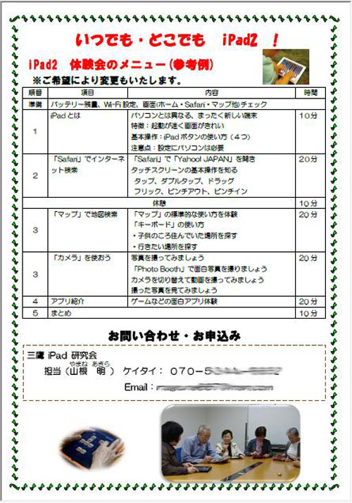 受講対象者:iPad2に興味があるがさわった事が無い人、持っているが使い方が分からない人